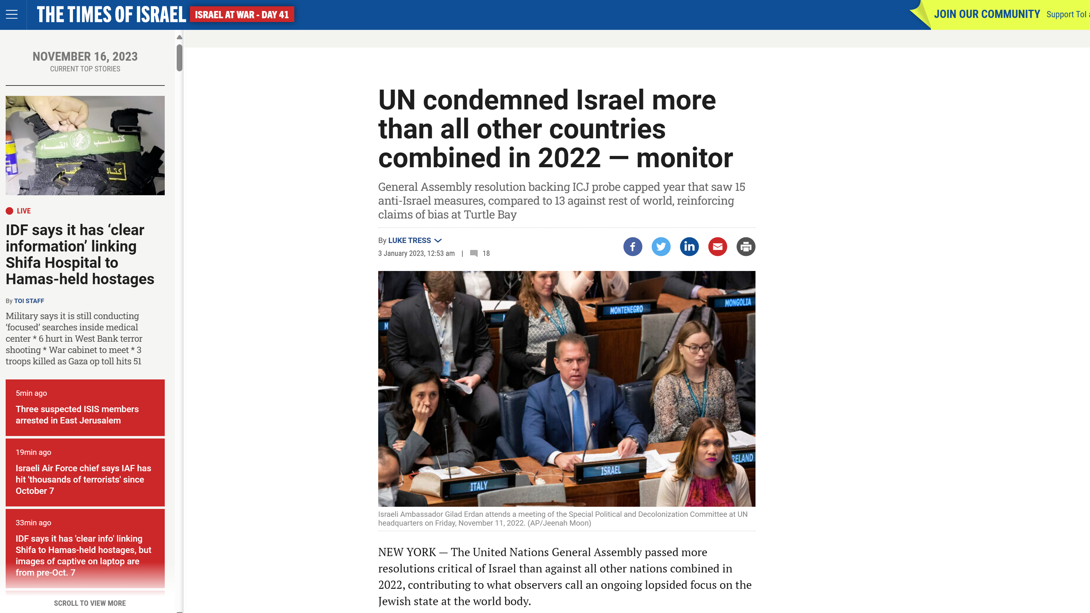 - The UN General Assembly regularly passes more resolutions condemning Israel than those condemning all other countries combined, including Syria, North Korea, South Sudan and Iran. The UN Human Rights Council has a permanent agenda item requiring discussion of Israel and no other named country.