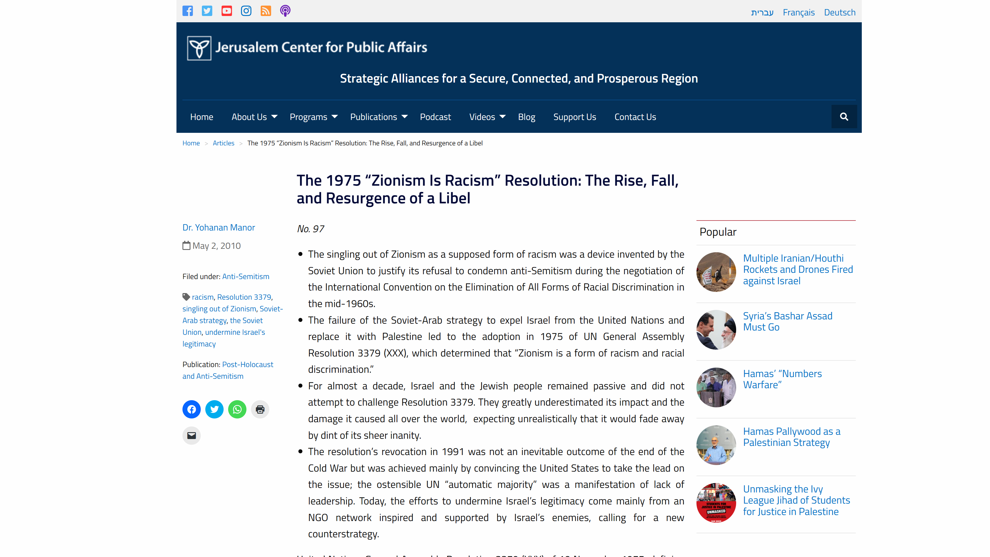 - On Nov 10, 1975, the UN General Assembly passed Resolution 3379, determining that Zionism is “a form of racism and racial discrimination.” This was eventually revoked in 1991